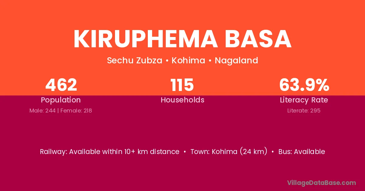 Kohima (24 km) is the nearest town to Kiruphema Basa village for major economic activities and is located approximately 24 km away.
