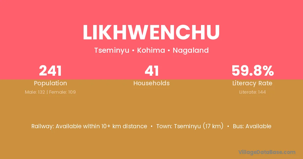 Likhwenchu village has a total population of 241 people, of which 132 are males and 109 are females.