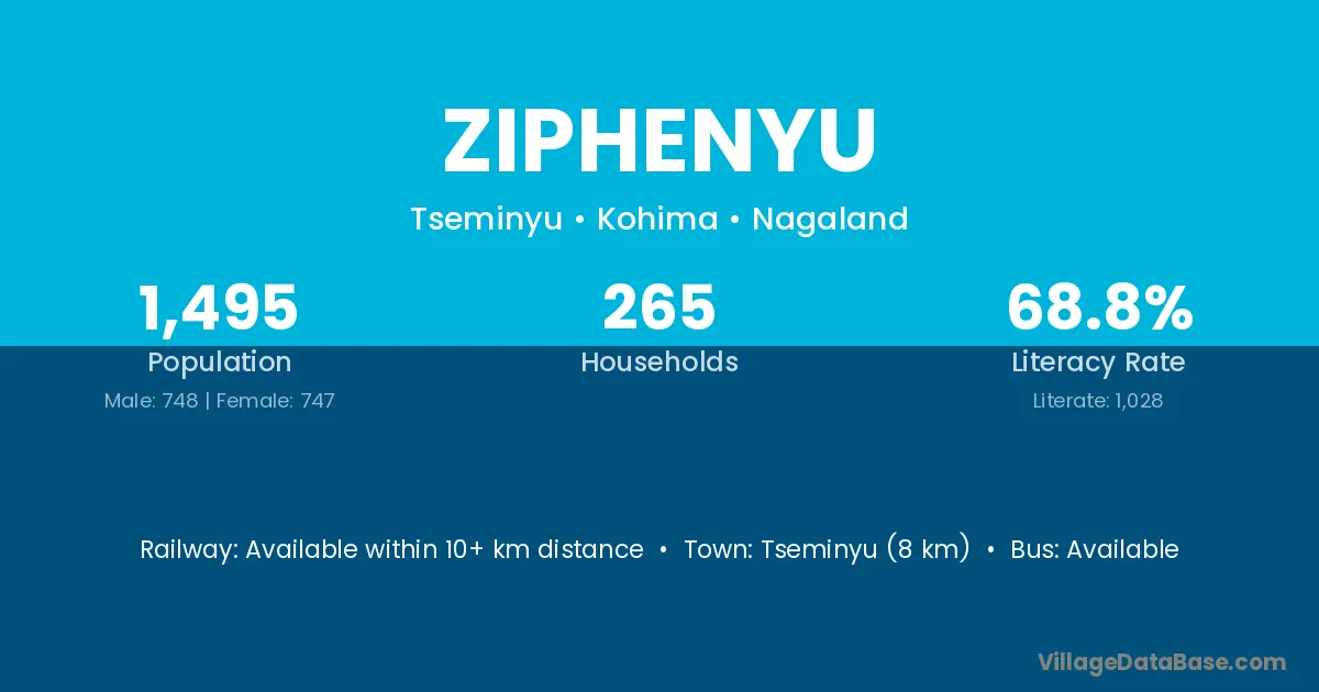 Ziphenyu village has a total population of 1,495 people, of which 748 are males and 747 are females.