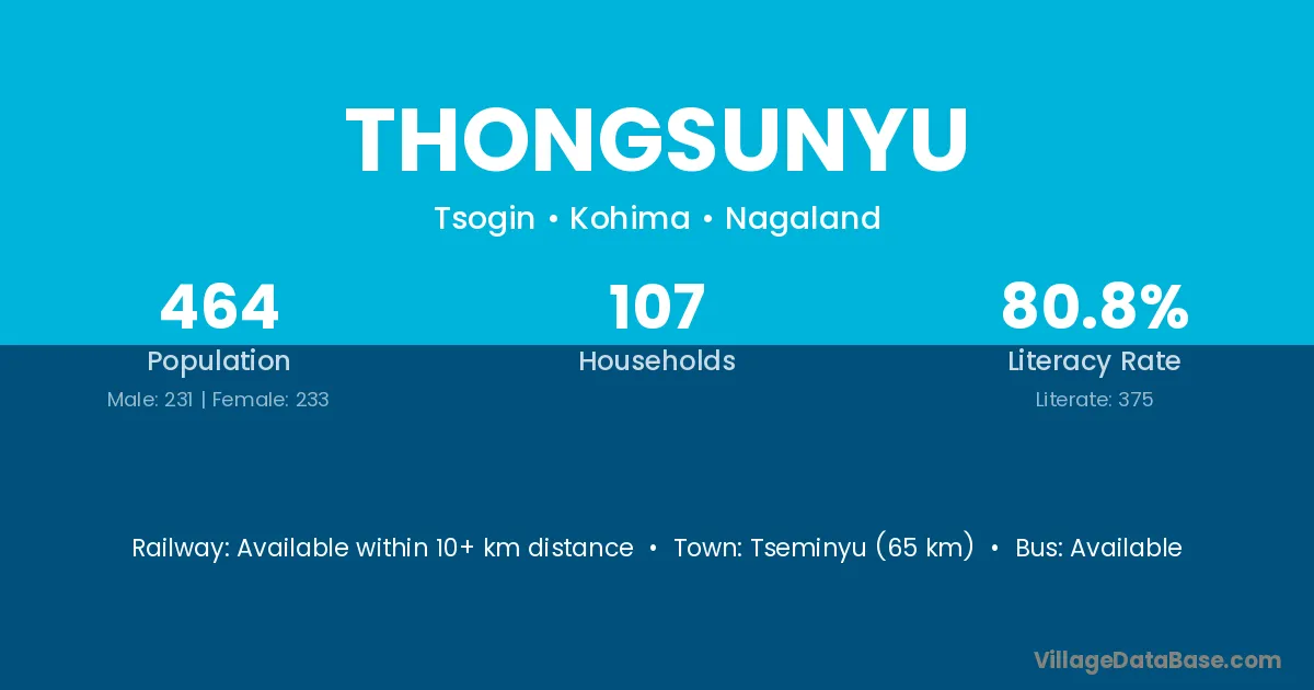 Tseminyu (65 km) is the nearest town to Thongsunyu village for major economic activities and is located approximately 65 km away.