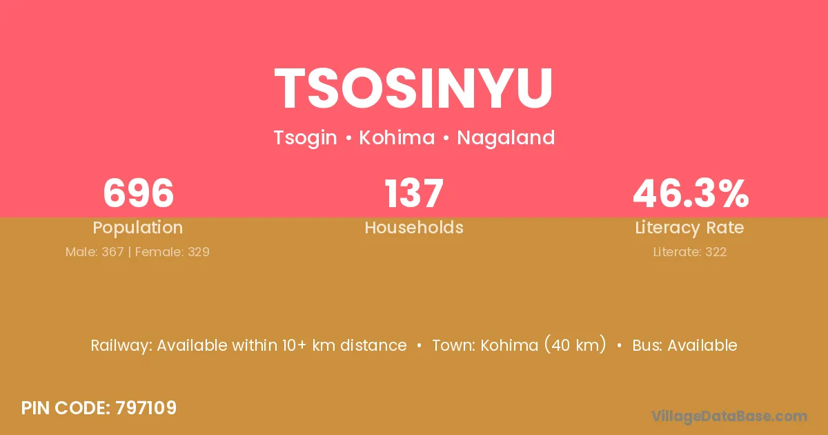 Kohima (40 km) is the nearest town to Tsosinyu village for major economic activities and is located approximately 40 km away.