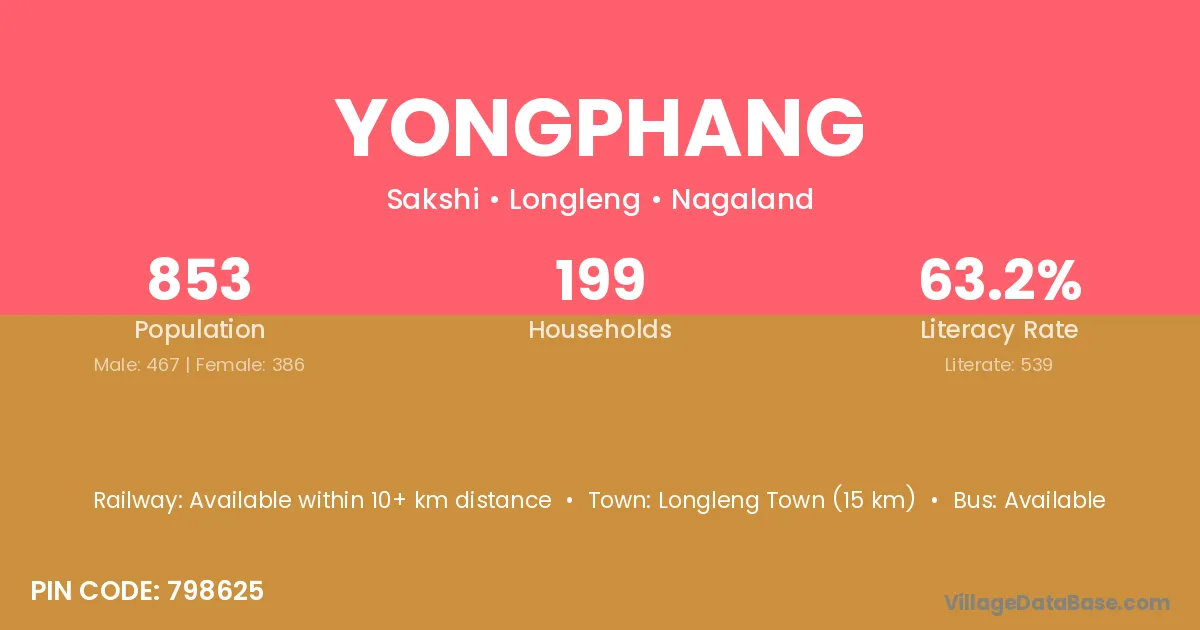 Longleng Town (15 km) is the nearest town to Yongphang village for major economic activities and is located approximately 15 km away.