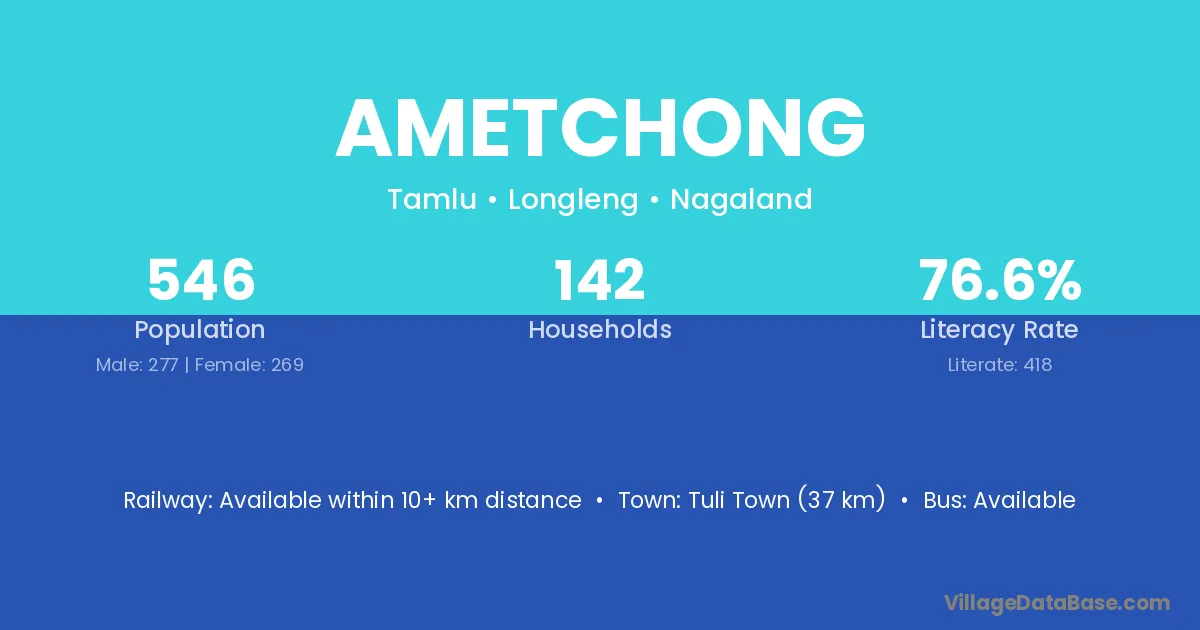 The literacy rate of Ametchong village is 76.56%. Male literacy stands at 74.01% and female literacy at 79.18%.