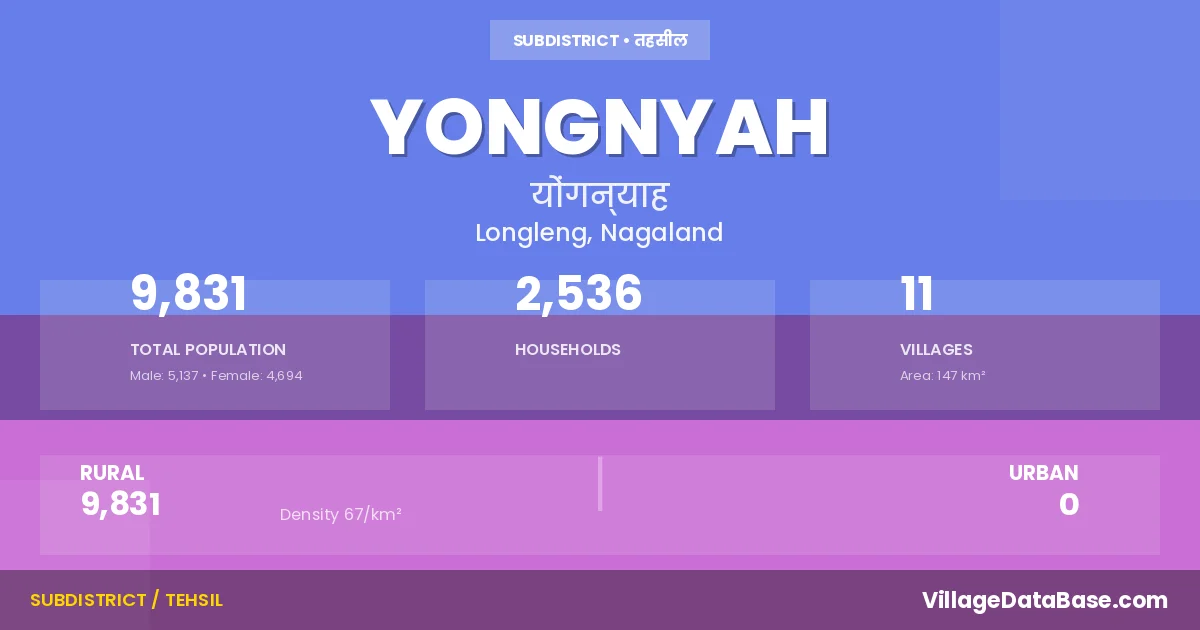 Yongnyah is a town and Circle in the Longleng district of the Nagaland. In India, a Circle is a subdivision of a district responsible for the administration and revenue collection of a specific area within the district. Circles play a crucial role in the local governance structure, contributing significantly to the development and administration of their communities.