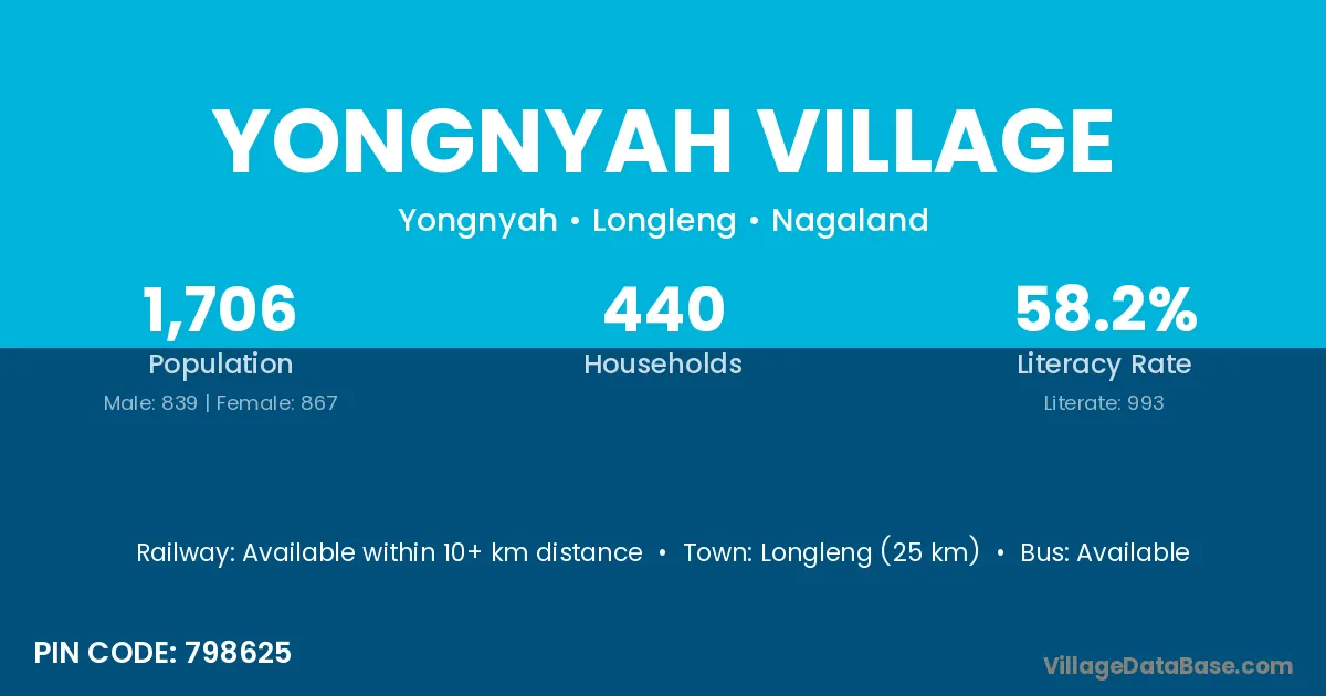 Longleng (25 km) is the nearest town to Yongnyah Village village for major economic activities and is located approximately 25 km away.