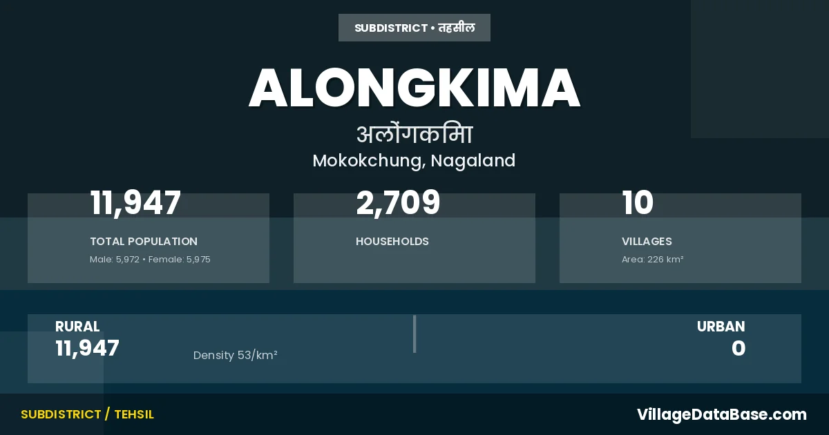 Alongkima is a town and Circle in the Mokokchung district of the Nagaland. In India, a Circle is a subdivision of a district responsible for the administration and revenue collection of a specific area within the district. Circles play a crucial role in the local governance structure, contributing significantly to the development and administration of their communities.