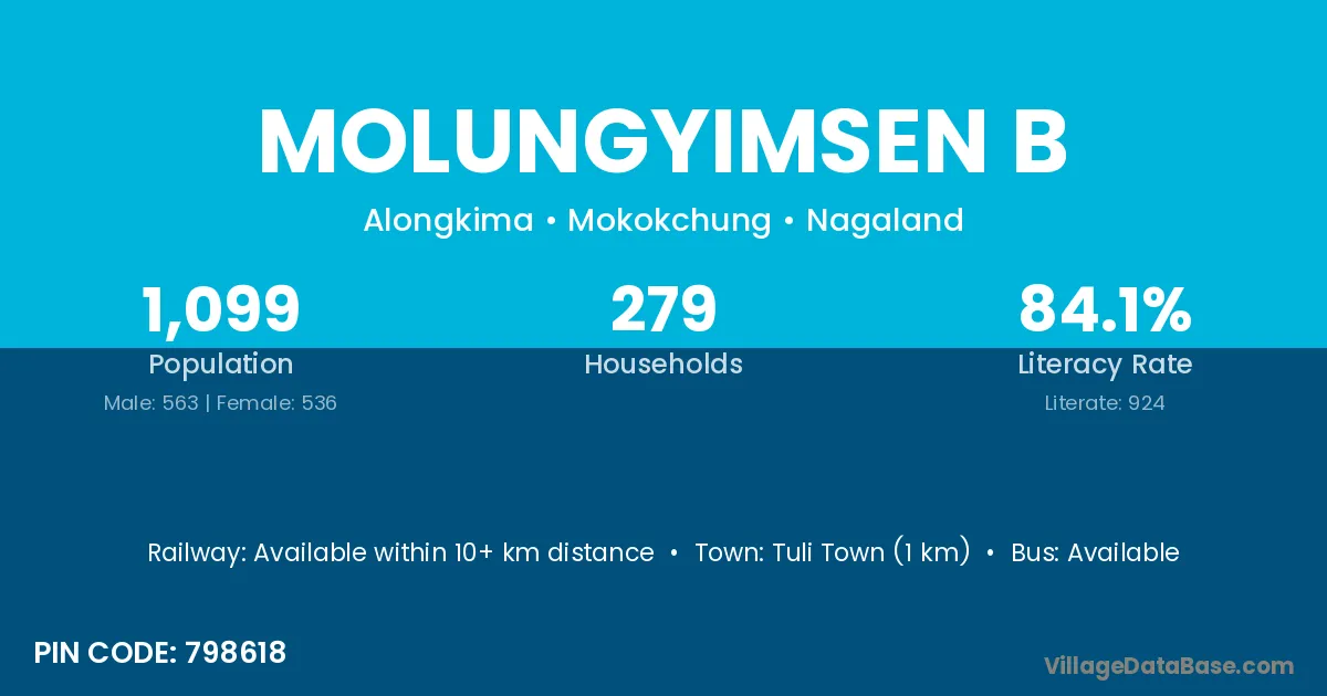 Molungyimsen B village has a total population of 1,099 people, of which 563 are males and 536 are females.