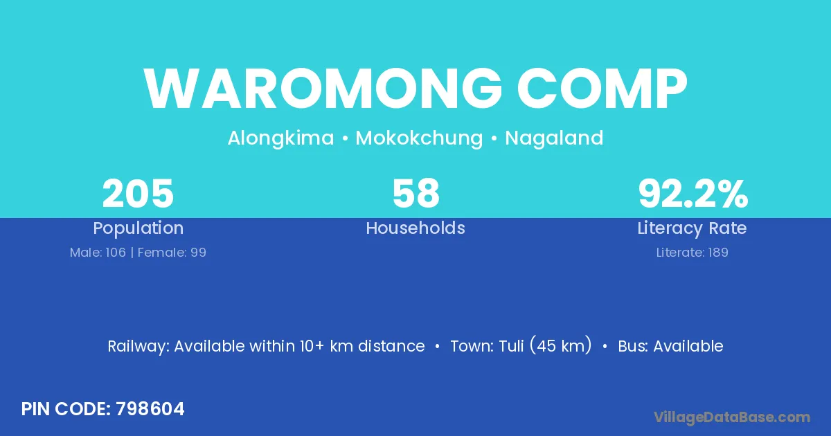 The literacy rate of Waromong Comp village is 92.20%. Male literacy stands at 89.62% and female literacy at 94.95%.
