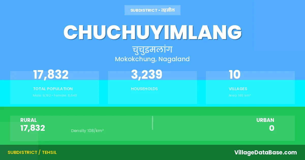 According to the 2011 census The total area of Chuchuyimlang Circle is 165 km², with a population of 17832 people. The population density is 108 inhabitants per square kilometre, and there are approximately 3239 houses in the sub district.