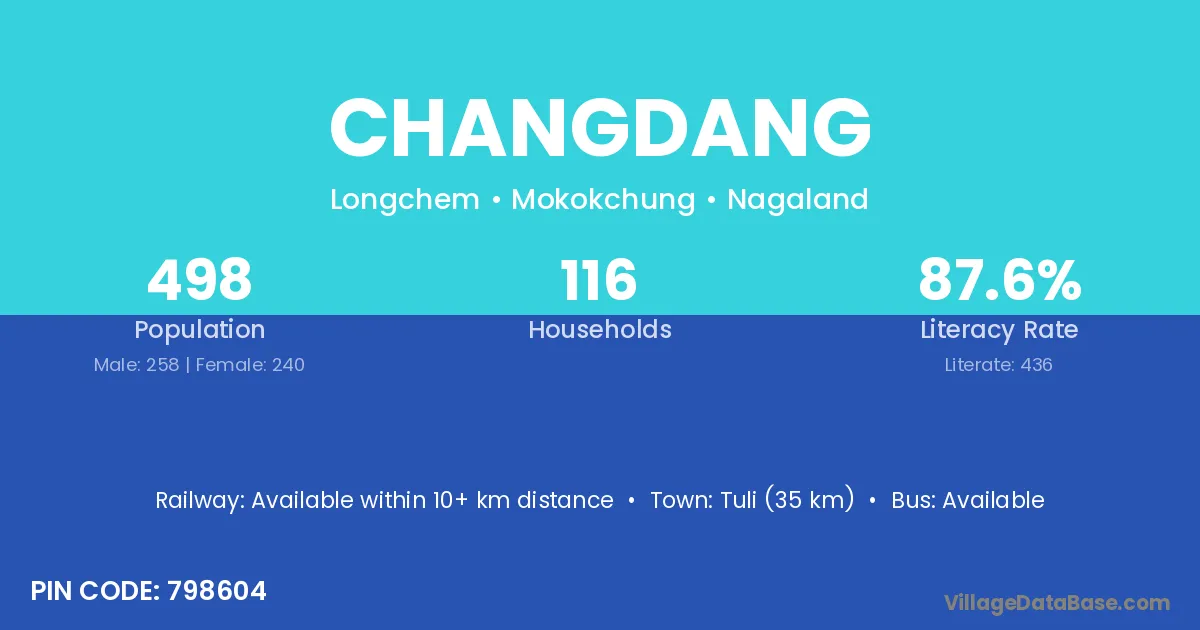Changdang village has a total population of 498 people, of which 258 are males and 240 are females.
