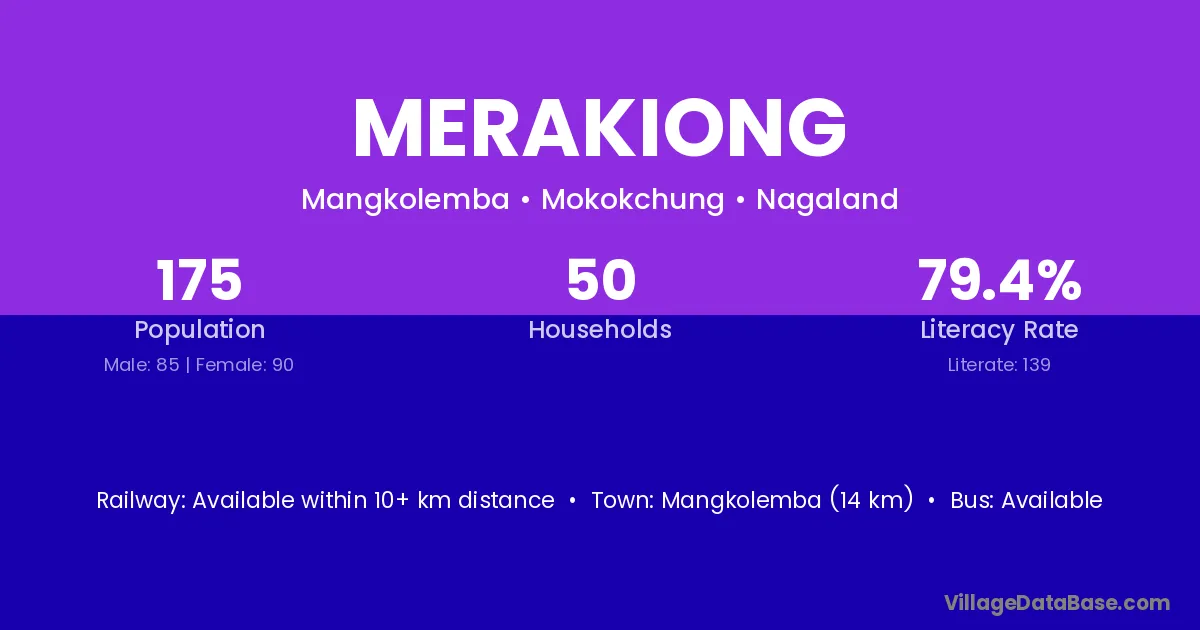Mangkolemba (14 km) is the nearest town to Merakiong village for major economic activities and is located approximately 14 km away.