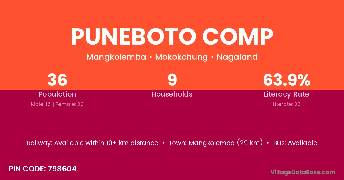 Puneboto Comp village has a total population of 36 people, of which 16 are males and 20 are females.