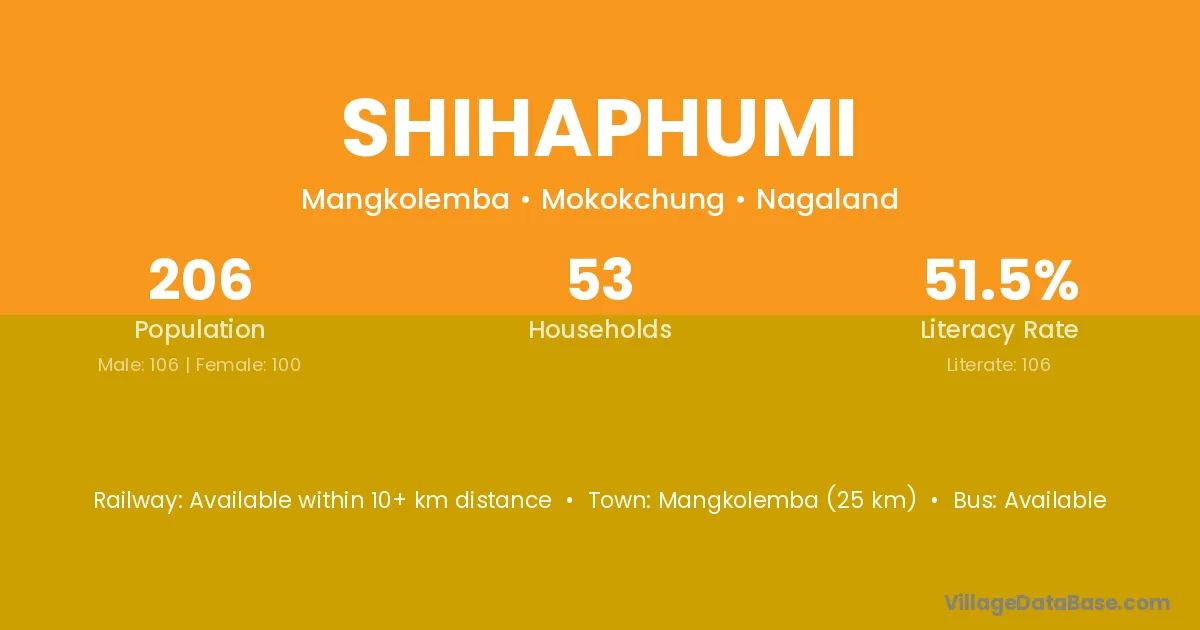Mangkolemba (25 km) is the nearest town to Shihaphumi village for major economic activities and is located approximately 25 km away.