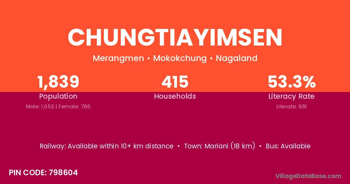 Chungtiayimsen village has a total population of 1,839 people, of which 1,053 are males and 786 are females.