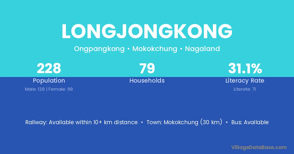 Mokokchung (30 km) is the nearest town to Longjongkong village for major economic activities and is located approximately 30 km away.
