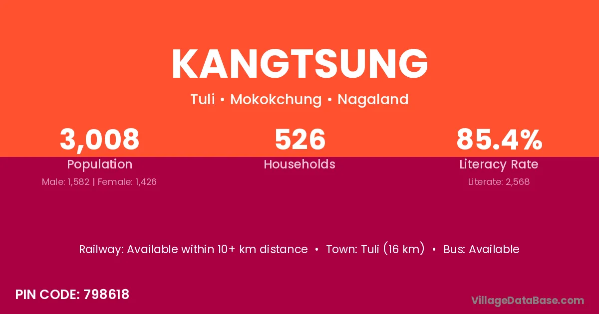 Kangtsung village has a total population of 3,008 people, of which 1,582 are males and 1,426 are females.