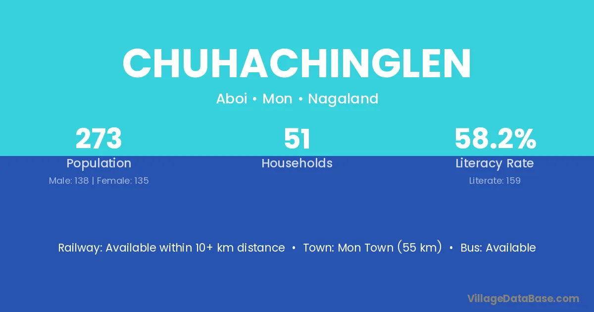 Chuhachinglen village has a total population of 273 people, of which 138 are males and 135 are females.