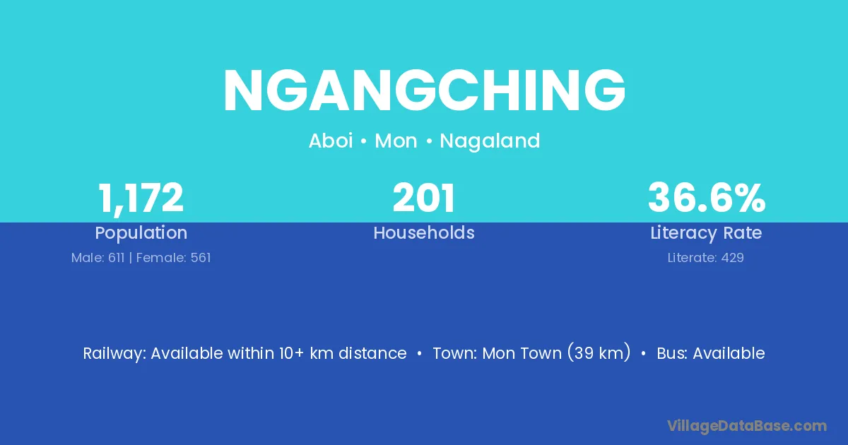Mon Town (39 km) is the nearest town to Ngangching village for major economic activities and is located approximately 39 km away.