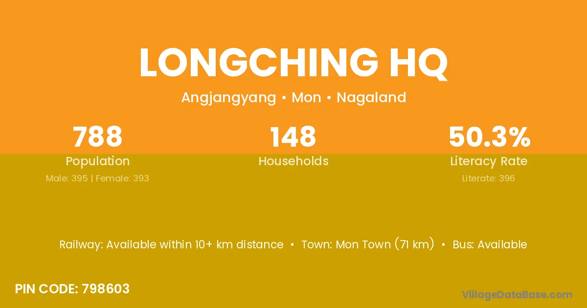 Mon Town (71 km) is the nearest town to Longching Hq village for major economic activities and is located approximately 71 km away.