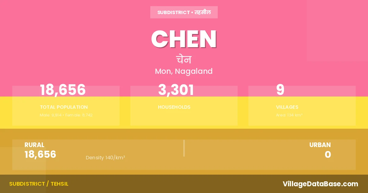 Chen is a town and Circle in the Mon district of the Nagaland. In India, a Circle is a subdivision of a district responsible for the administration and revenue collection of a specific area within the district. Circles play a crucial role in the local governance structure, contributing significantly to the development and administration of their communities.