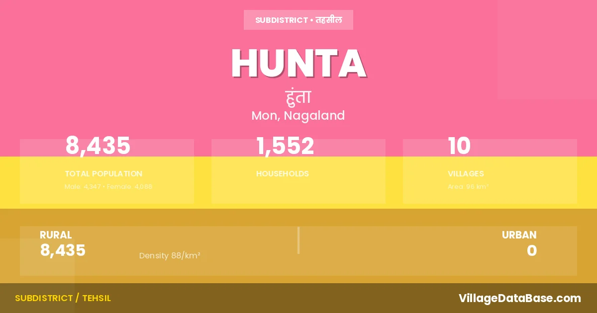 Hunta is a town and Circle in the Mon district of the Nagaland. In India, a Circle is a subdivision of a district responsible for the administration and revenue collection of a specific area within the district. Circles play a crucial role in the local governance structure, contributing significantly to the development and administration of their communities.