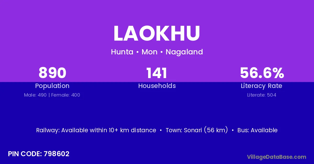 Sonari (56 km) is the nearest town to Laokhu village for major economic activities and is located approximately 56 km away.
