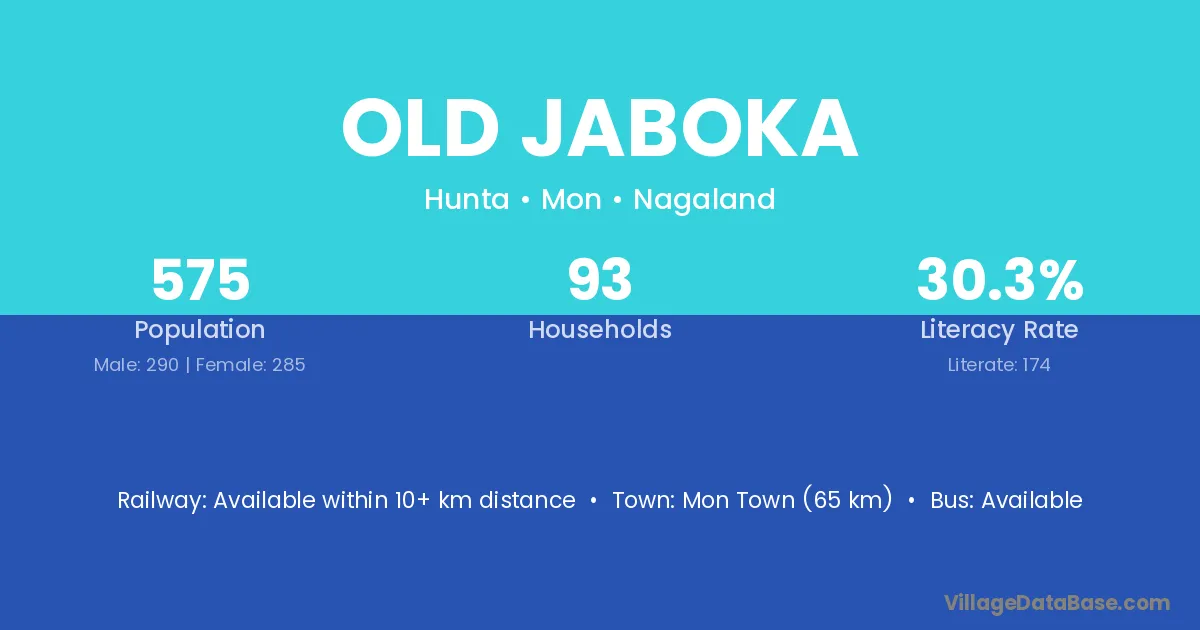 Mon Town (65 km) is the nearest town to Old Jaboka village for major economic activities and is located approximately 65 km away.