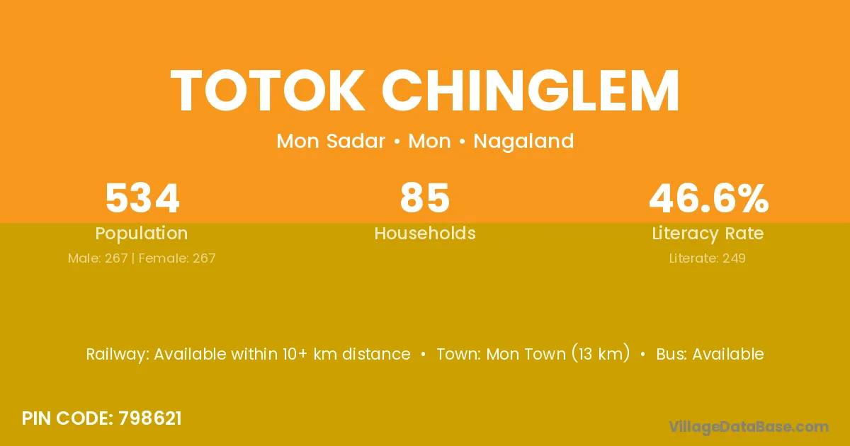 Mon Town (13 km) is the nearest town to Totok Chinglem village for major economic activities and is located approximately 13 km away.