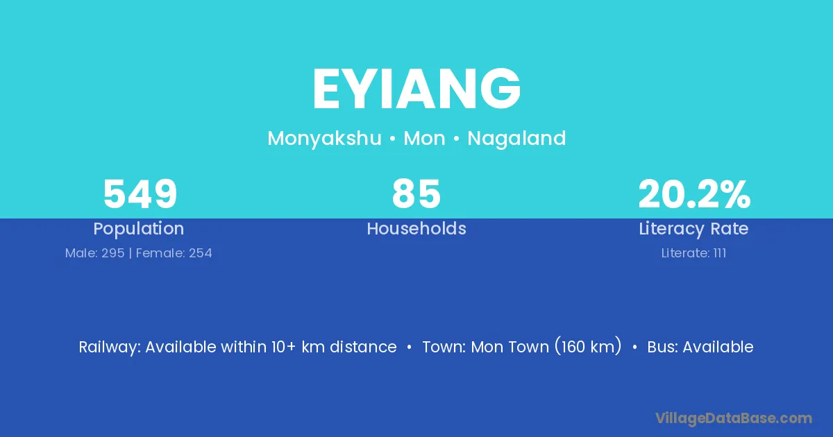 The literacy rate of Eyiang village is 20.22%. Male literacy stands at 25.42% and female literacy at 14.17%.