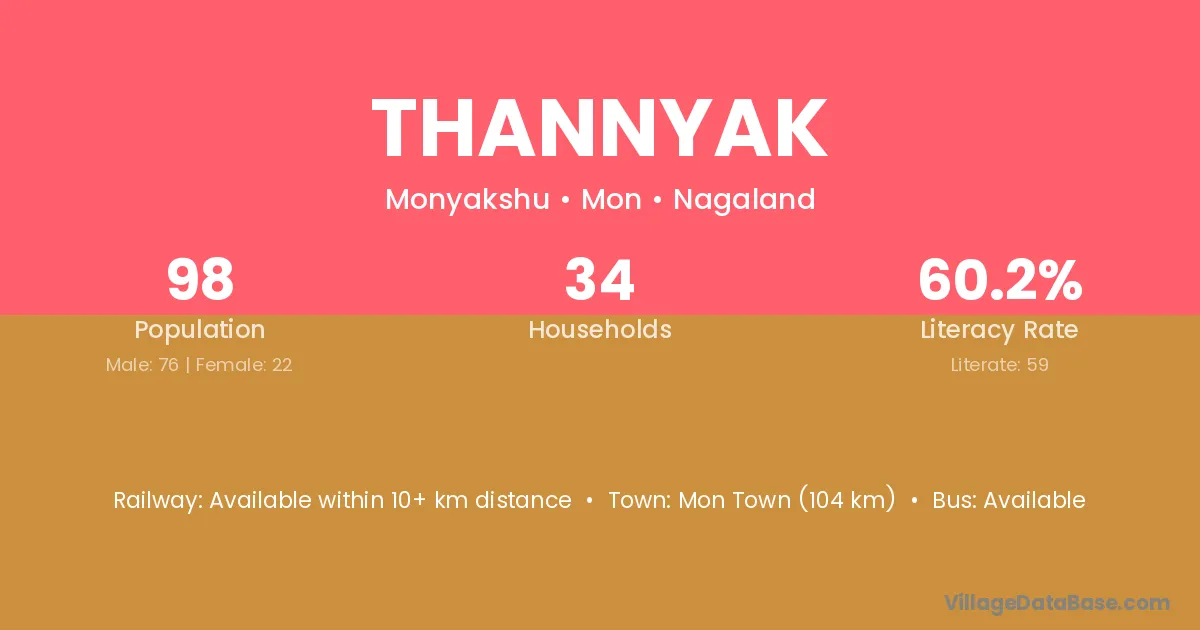 Thannyak village has a total population of 98 people, of which 76 are males and 22 are females.