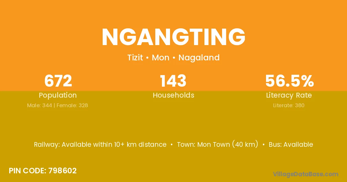 Ngangting village has a total population of 672 people, of which 344 are males and 328 are females.