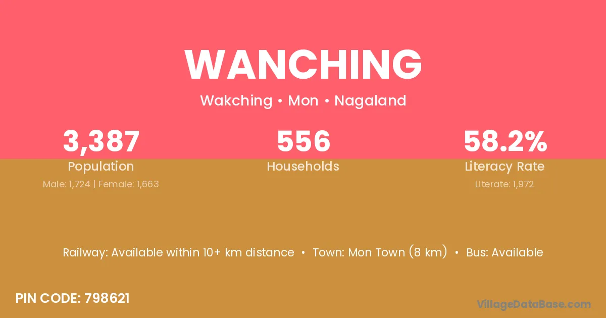 Wanching village has a total population of 3,387 people, of which 1,724 are males and 1,663 are females.