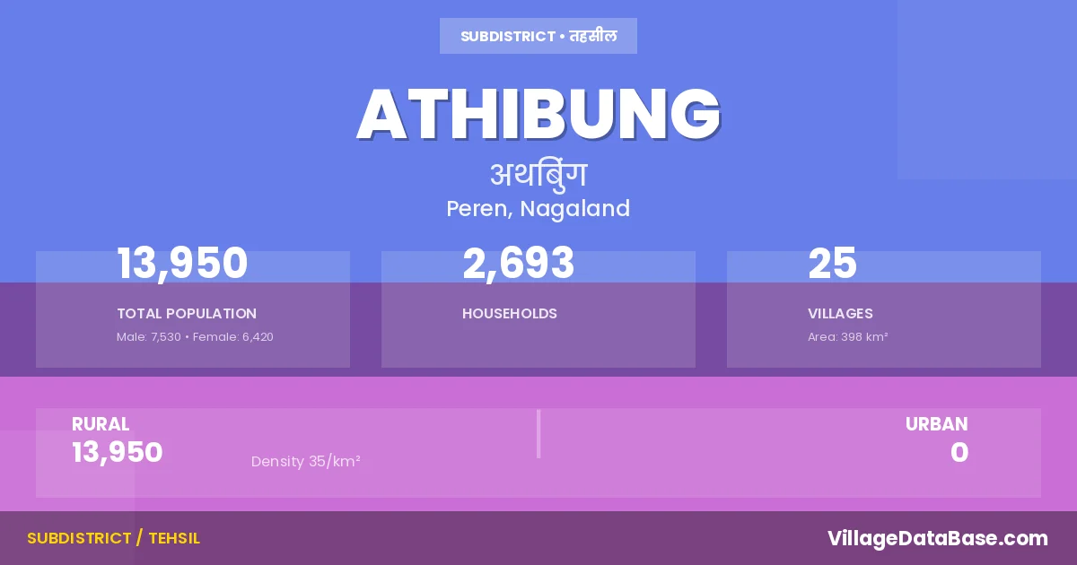 Athibung is a town and Circle in the Peren district of the Nagaland. In India, a Circle is a subdivision of a district responsible for the administration and revenue collection of a specific area within the district. Circles play a crucial role in the local governance structure, contributing significantly to the development and administration of their communities.