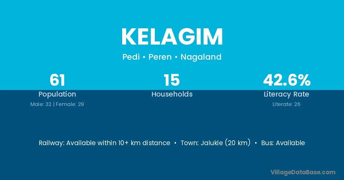 Jalukie (20 km) is the nearest town to Kelagim village for major economic activities and is located approximately 20 km away.