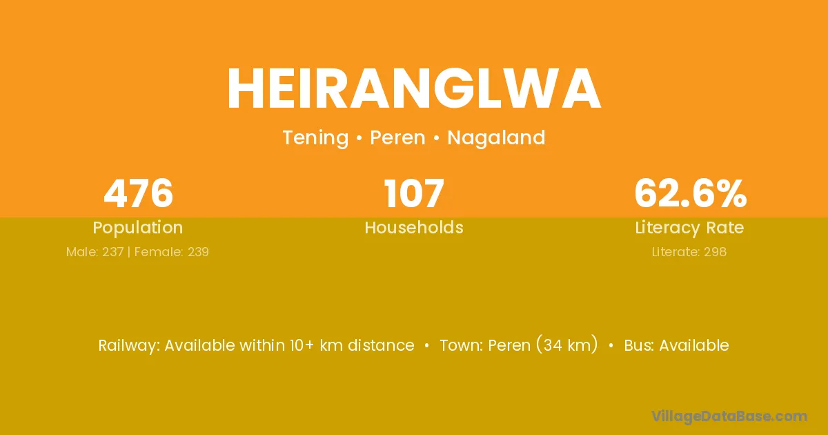 Heiranglwa village has a total population of 476 people, of which 237 are males and 239 are females.