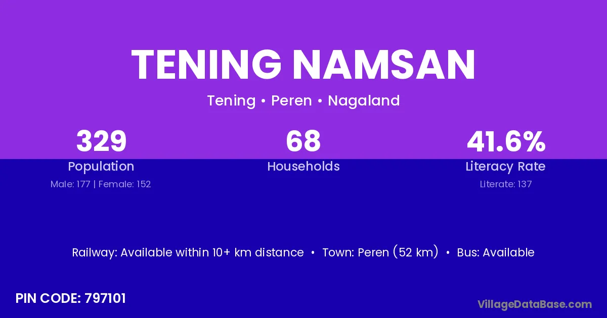 Peren (52 km) is the nearest town to Tening Namsan village for major economic activities and is located approximately 52 km away.