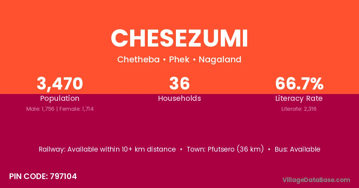 Pfutsero (36 km) is the nearest town to Chesezumi village for major economic activities and is located approximately 36 km away.