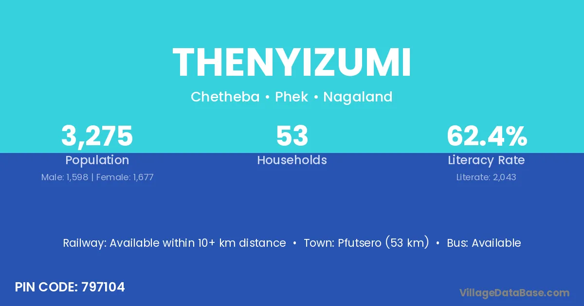 Pfutsero (53 km) is the nearest town to Thenyizumi village for major economic activities and is located approximately 53 km away.