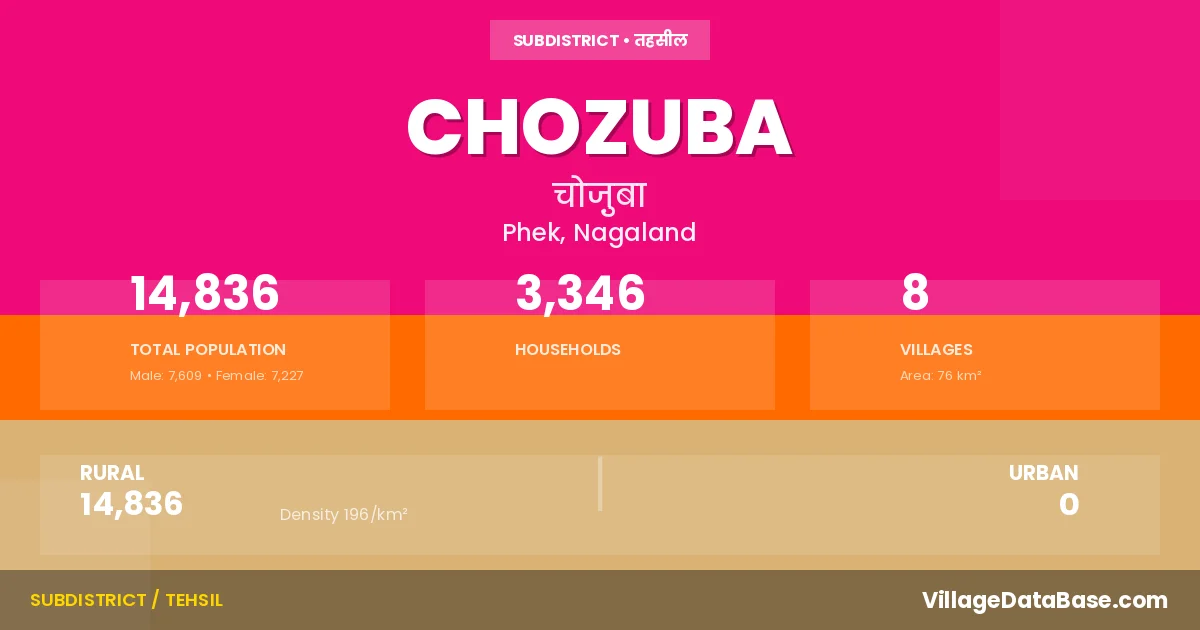 Chozuba is a town and Circle in the Phek district of the Nagaland. In India, a Circle is a subdivision of a district responsible for the administration and revenue collection of a specific area within the district. Circles play a crucial role in the local governance structure, contributing significantly to the development and administration of their communities.