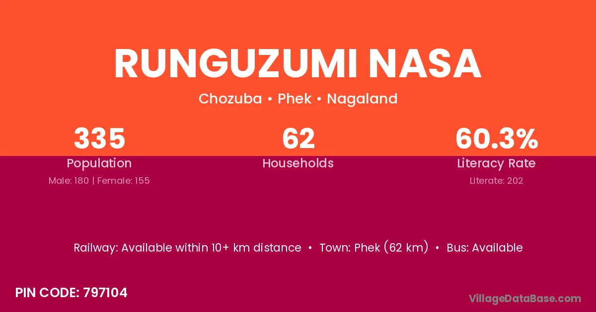 Phek (62 km) is the nearest town to Runguzumi Nasa village for major economic activities and is located approximately 62 km away.