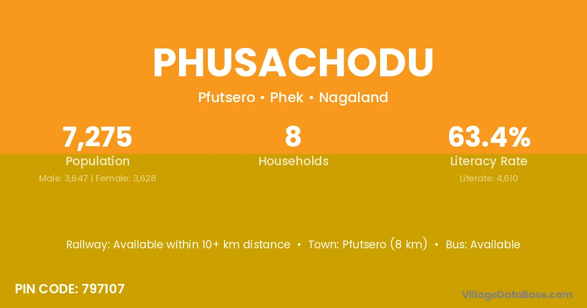 Pfutsero (8 km) is the nearest town to Phusachodu village for major economic activities and is located approximately 8 km away.