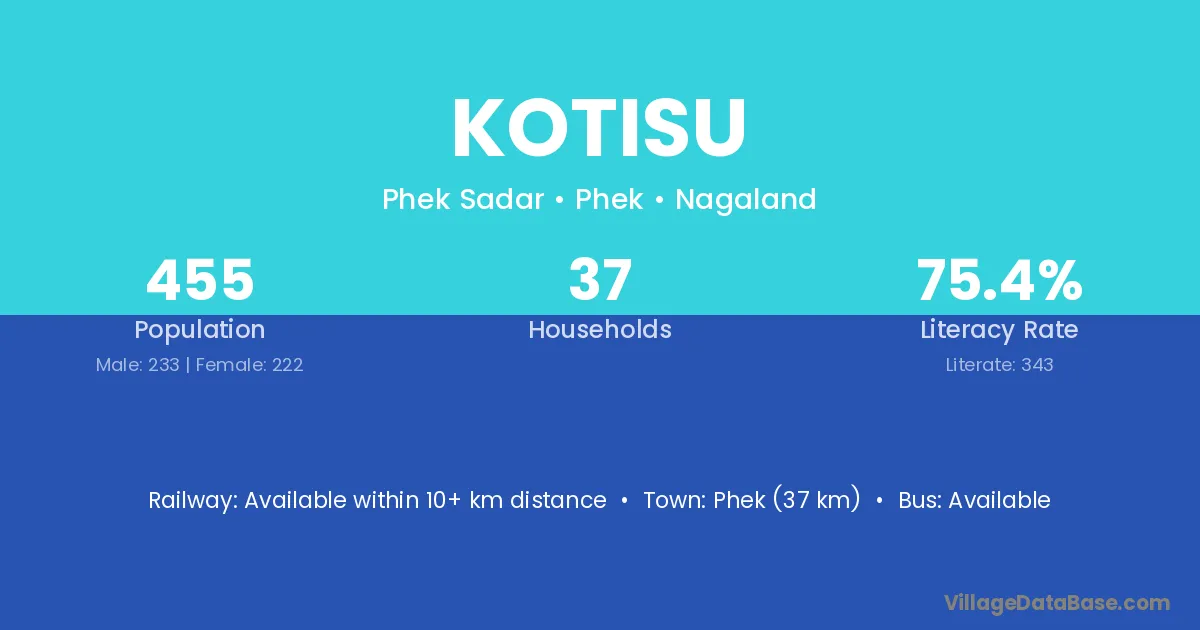 Kotisu village has a total population of 455 people, of which 233 are males and 222 are females.