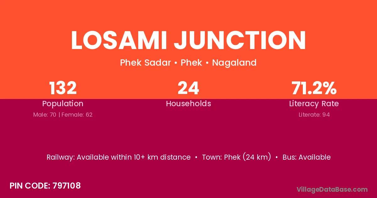Phek (24 km) is the nearest town to Losami Junction village for major economic activities and is located approximately 24 km away.