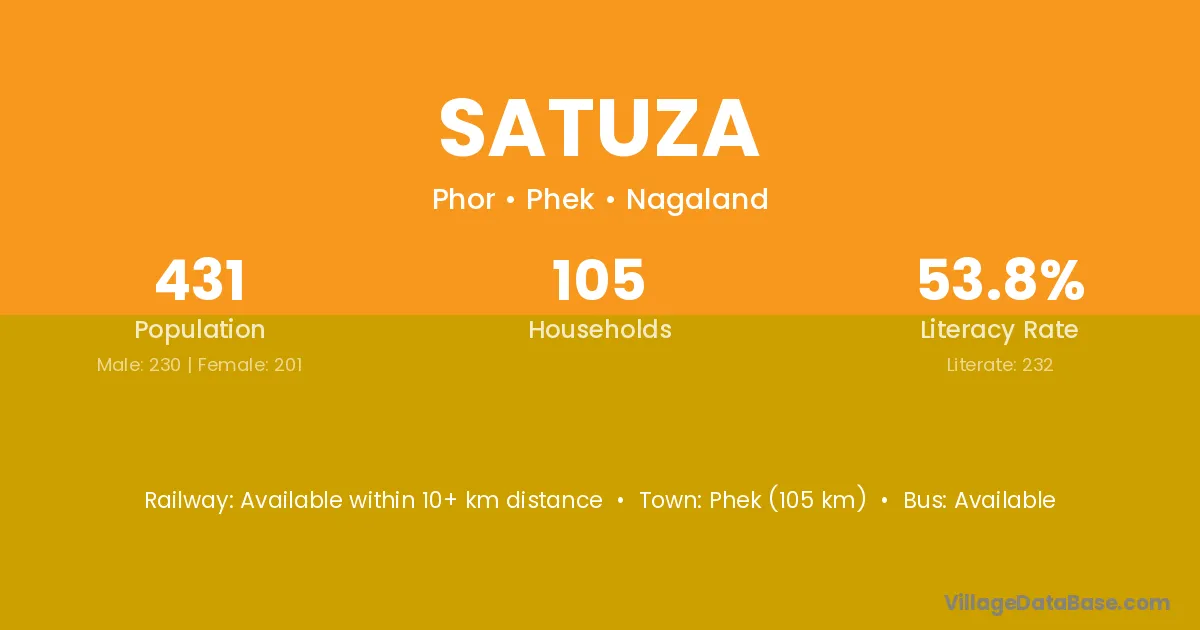Satuza village has a total population of 431 people, of which 230 are males and 201 are females.