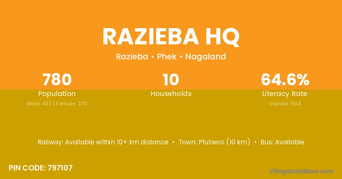 Pfutsero (10 km) is the nearest town to Razieba Hq village for major economic activities and is located approximately 10 km away.