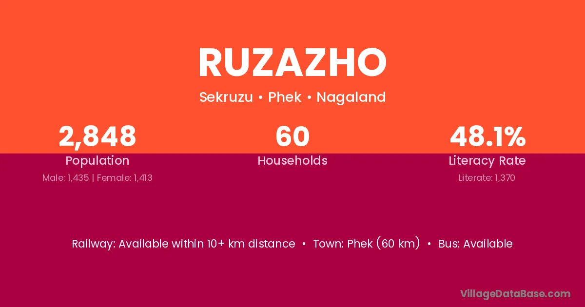 Phek (60 km) is the nearest town to Ruzazho village for major economic activities and is located approximately 60 km away.