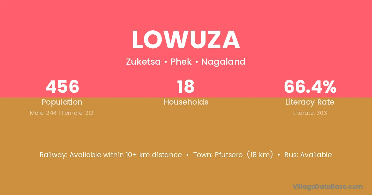 Pfutsero (18 km) is the nearest town to Lowuza village for major economic activities and is located approximately 18 km away.