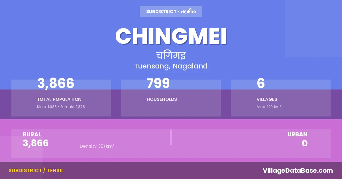 Chingmei is a town and Circle in the Tuensang district of the Nagaland. In India, a Circle is a subdivision of a district responsible for the administration and revenue collection of a specific area within the district. Circles play a crucial role in the local governance structure, contributing significantly to the development and administration of their communities.