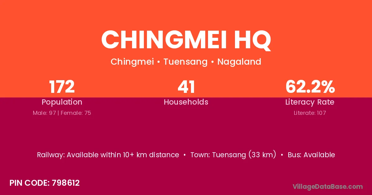 Tuensang (33 km) is the nearest town to Chingmei Hq village for major economic activities and is located approximately 33 km away.