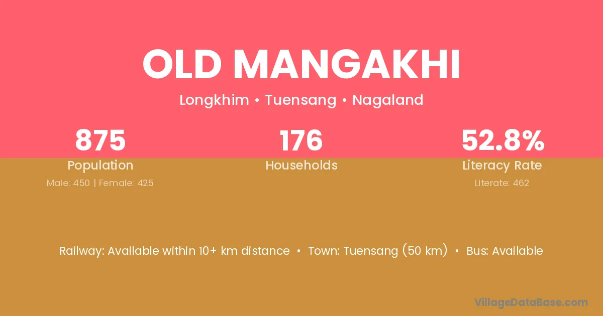 Tuensang (50 km) is the nearest town to Old Mangakhi village for major economic activities and is located approximately 50 km away.